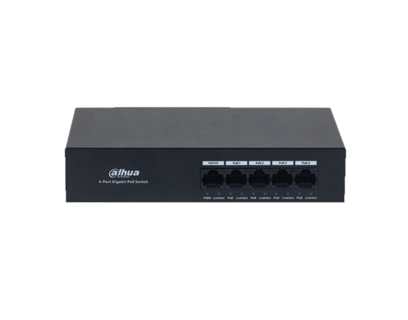 Switch PoE de 4 puertos con potencia total de 36W, ideal para cámaras IP en instalaciones pequeñas. Permite transmisión de datos y energía en un solo cable.